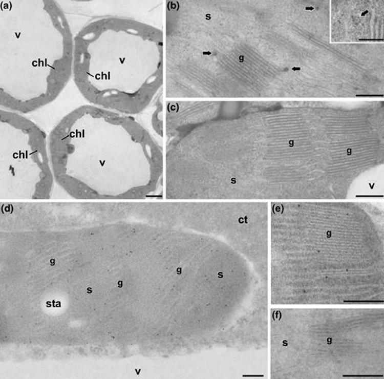 Figura 2: Inmunomarcado con oro coloidal de cloroplastos de hojas de tabaco transgénico que expresan el gen de la seroalbúmina humana (HSA). La HSA se concentra exclusivamente en los cuerpos proteicos (pb) que se forman dentro del cloroplasto. (b): Inmunomarcado con oro coloidal de cloroplastos de hojas de tabaco transgénico que expresan una proteína de fusión HSA y tiorredoxina (Trx-HSA). Las proteínas de fusión se encuentran exclusiva y masivamente en los cuerpos proteicos, independientemente de sus tamaños. (c-e): Doble inmunomarcado de HSA (partículas de oro de 5 nm) y Trx (partículas de oro de 10 nm) en cloroplastos que coexpresan ambas proteínas. La señal correspondiente a ambas proteínas se encuentra exclusivamente dentro del cloroplasto, donde se distribuye principalmente con un patrón disperso. Sin embargo, se observan algunos grupos (puntas de flecha) donde las partículas HSA y Trx se localizan conjuntamente (d, e). Referencia.