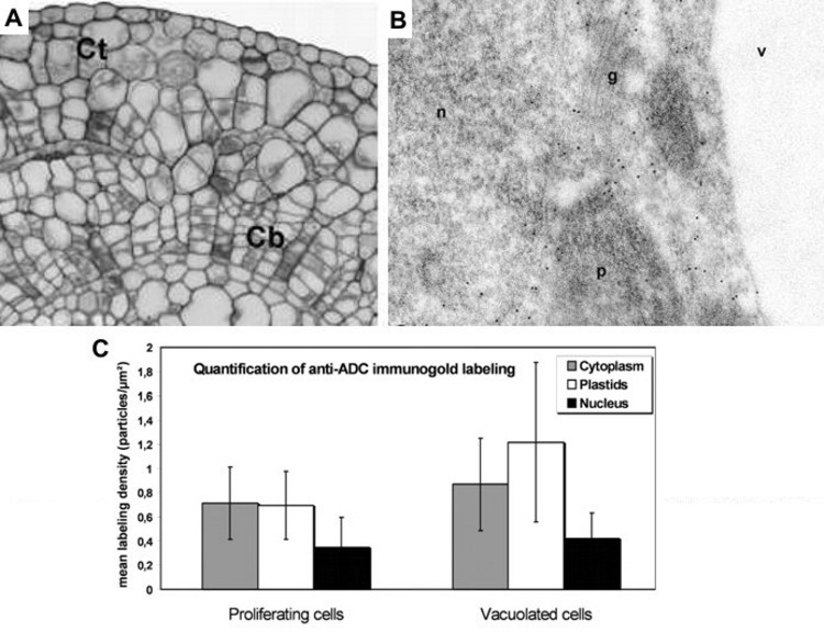 Figura 3: Estudio histológico (A), inmunolocalización de arginina descarboxilasa mediante inmunomarcado con oro coloidal (B) y cuantificación del inmunomarcado (C) en nódulos organogénicos de lúpulo (Humulus lupulus) fijados químicamente. Referencia.
