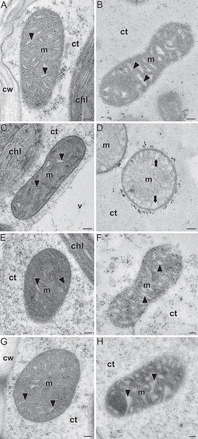Figura 4: Ultraestructura de mitocondrias (m) en hojas (A,C,E,G) y endospermos de 24 días tras la polinización (B,D,F,H) de plantas wild type (A,B), Zmbt1-1 (C,D), Sh2 (E,F), y semillas Zmbt1-1::MitTPr-ΔTP-ZmBT1-1(1) (G,H). Las cabezas de flecha señalan las crestas mitocondriales. Nótese su ausencia en (D), donde solo se observan invaginaciones redondeadas en la periferia (flechas). chl, cloroplasto; ct, citoplasma; cw, pared celular; v, vacuola. Barras: 100 nm. Referencia.