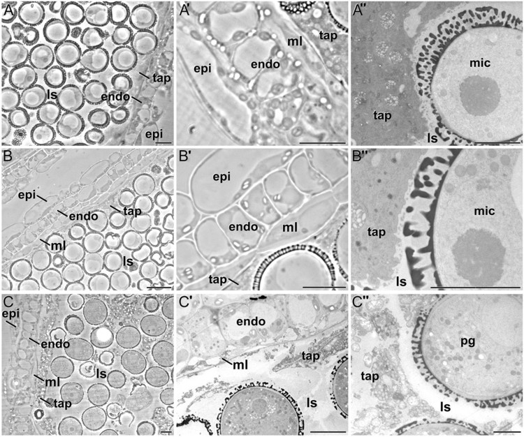 Figura 5: Diferentes tejidos de las anteras de B. napus durante tres etapas de desarrollo: anteras de 2,4 mm de largo (A – A ″), anteras de 3,0 mm de largo (B – B ″) y anteras de 3,7 mm de largo (C – C ″). endo, endotecio; epi, epidermis; ls, espacio locular; mic, microsporas; ml, capa intermedia; pg, grano de polen; tap, tapetum. Barras: A – C, A′ – C ′, 10 μm; A ″ –C ″, 5 μm. Referencia.