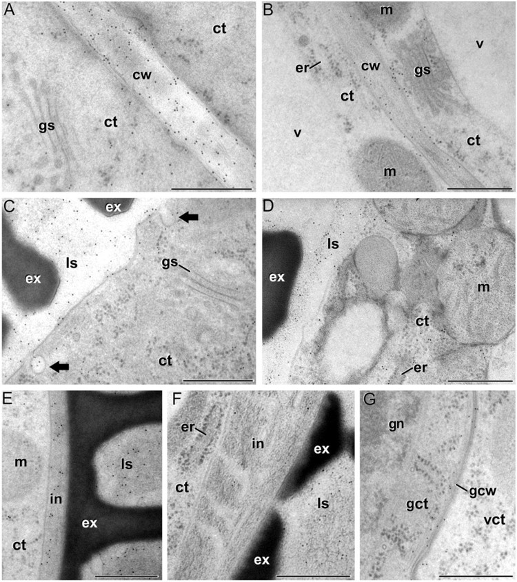 Figura 6: Inmunolocalización de epítopos de la AGP JIM13. (A, B) Endotecio. Tanto en anteras de 2,4 (A) como de 3,7 mm de largo (B), los epítopos JIM13 decoran las cisternas de Golgi (gs), desde donde estos epítopos son enviados a las paredes celulares (cw). (C, D) Tapetum. En el tapetum de anteras de 2,4 mm (C), se liberan epítopos JIM13 al espacio locular (ls) a través de vesículas (flechas), mientras que estos epítopos se dispersan por todo el citoplasma de las células tapetales degradadas en anteras de 3,7 mm (D). (E) Microspora de una antera de 2.4 mm. (F, G) Grano de polen de una antera de 3,7 mm. En (E) y (F), las partículas de oro solo decoran la intina (in) y el espacio locular. En (G), el inmunomarcado se concentra en la pared de la célula generativa (gcw) que separa los citoplasmas generativos (gct) y vegetativos (vct). Ct, citoplasma; er, retículo endoplásmico; ex, exine; gn, núcleo generativo; m, mitocondria; v, vacuola. Barras: 500 nm. Referencia.