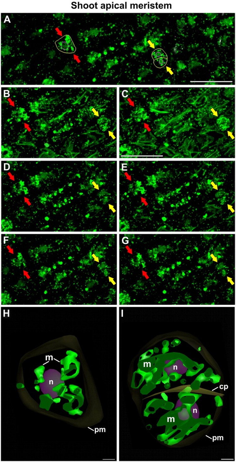 Figura 8: Imágenes confocales seriadas de mitocondrias en células interfásicas y en división del meristemo apical. A, Panorámica general de una región del meristemo apical resaltando una célula en interfase (flechas rojas, contorno amarillo) y una célula en división (flechas amarillas, contorno amarillo). B-G, secciones confocales consecutivas de 0,5 μm de grosor de las células resaltadas. H, modelo 3D de la célula en interfase. I, modelo 3D de la célula en división. Las membranas plasmáticas (pm) y la placa celular (cp) se muestran en amarillo oscuro, los núcleos (n) se muestran en púrpura y las mitocondrias (m) se muestran en verde. Barras = 25 μm en A-G y 1 μm en H e I. Referencia.