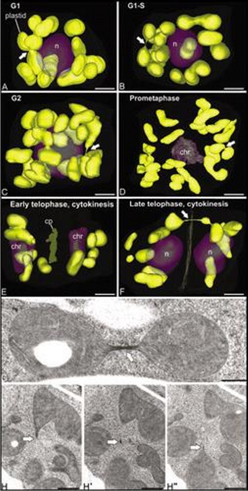 Figura 9: Cambios dependientes del ciclo celular en la distribución y la morfología de los plastidios de células de meristemo apical en Arabidopsis. (A-F) muestran reconstrucciones tridimensionales de todos los plastidios en seis células de meristemo apical en diferentes en etapas representativas del ciclo celular. Nótese que los plastidios mantienen su morfología típica (elongada o en forma de cacahuete) durante todo el ciclo celular y que no forman estructuras reticuladas. Las flechas apuntan a conexiones similares a estromulas entre plastidios. Como se ve en (G y H), estas estructuras estrechas de puente tienen longitudes muy variables, contienen materiales de estroma, pero carecen de tilacoides. (H, H") son tres secciones seriadas consecutivas extraídas de una reconstrucción tridimensional de una célula completa de meristemo apical. Barras en (A-F): 2 µm, (G, H): 500 nm. Referencia.